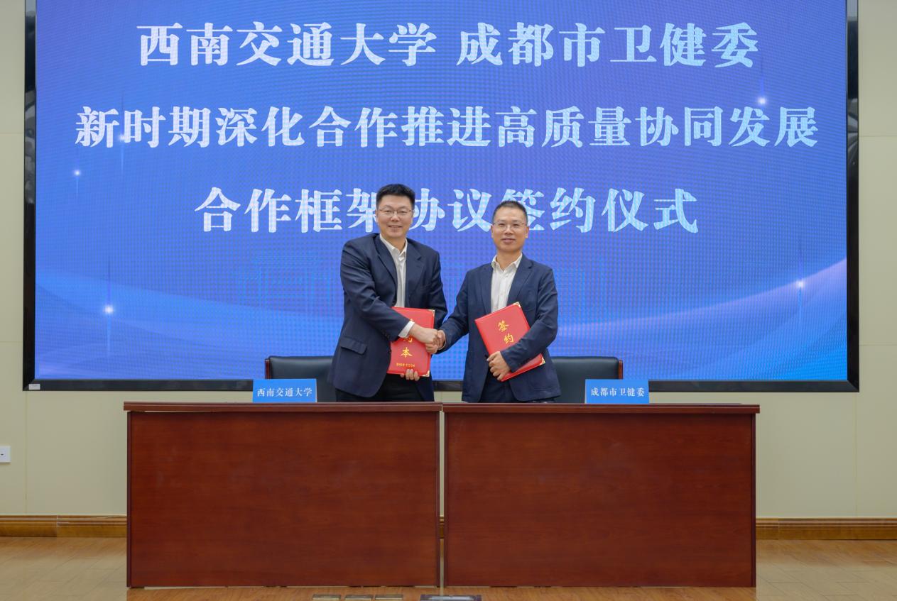 闫学东、杨晓涛代表双方签署西南交通大学与成都市卫生健康委员会新时期深化合作推进高质量协同发展合作框架协议。