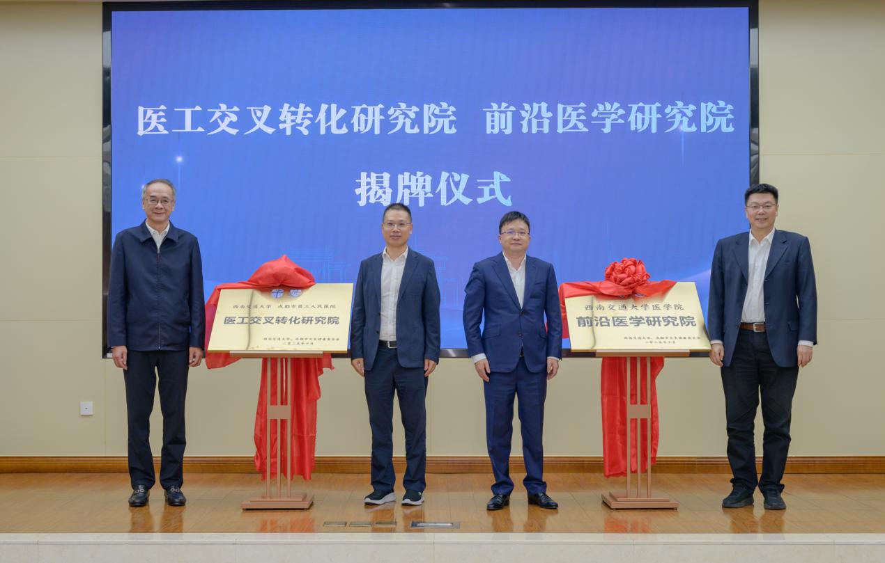 仪式现场,余敏明、杨晓涛、闫学东、白兰彬共同为医工交叉转化研究院、前沿医学研究院揭牌。
