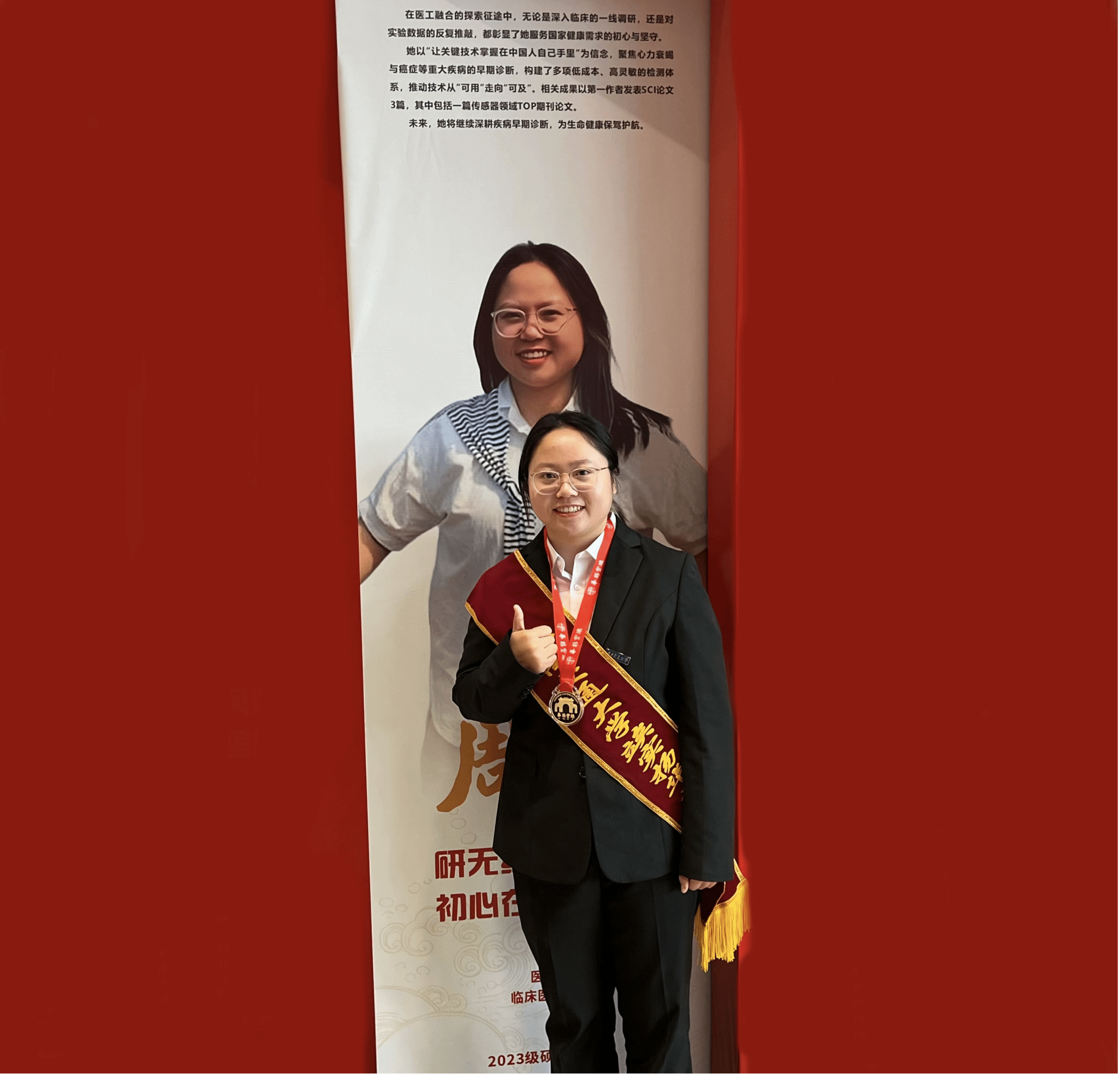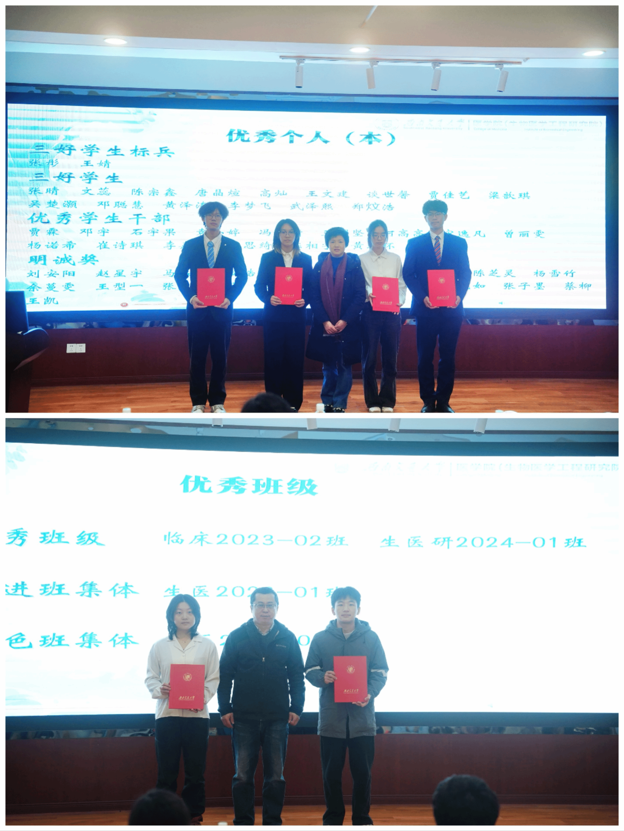 学院先后评选出学业奖学金358人、综合奖学金40人、国家奖学金12人、国家励志奖学金8人、扬华新秀奖学金1人、立德奖学金5人。评选出省级优秀毕业生7人、校级优秀毕业生17人,三好标兵、三好学生、优秀学生干部、优秀研究生标兵、优秀研究生干部等共计96人,先进、特色、优秀班集体4个。其中,我院临床2023-02班周一同学获评西南交通大学学生最高荣誉“竢实扬华奖章”(全校硕士仅四人获得)!校党委书记余敏明、校长闫学东为其颁奖。