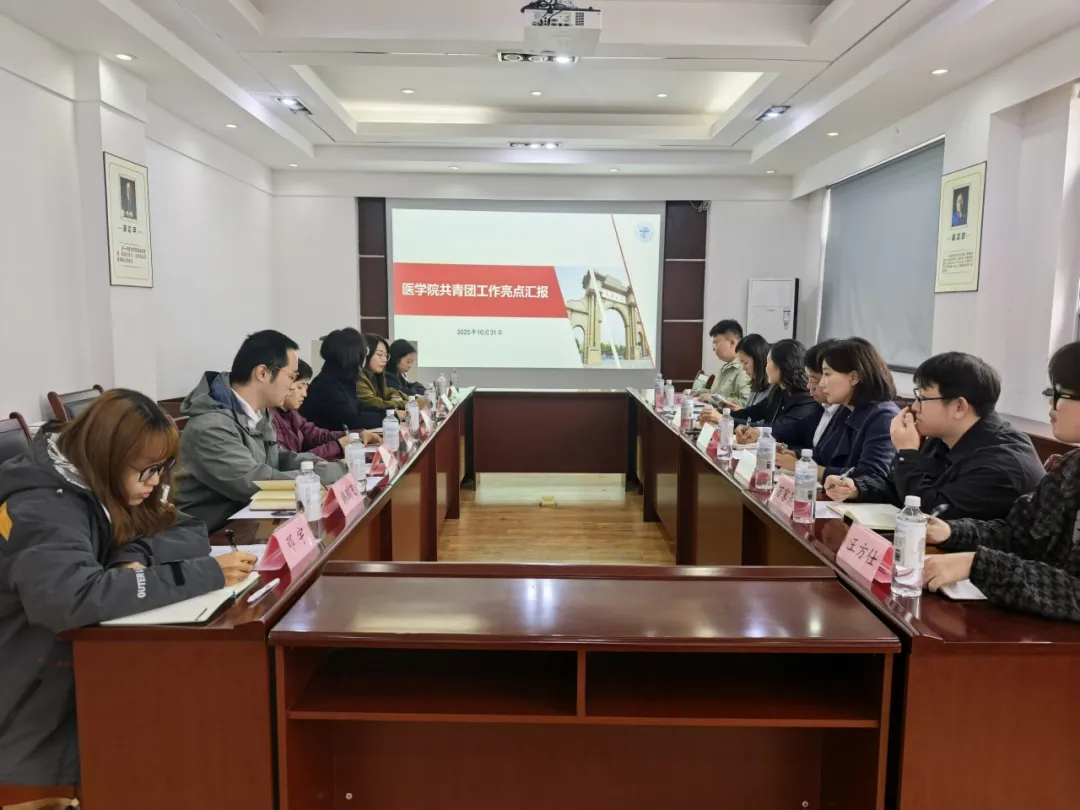 2025年10月31日,校团委到访医学院对学院共青团工作开展调研与交流,校团委书记武俊、团委副书记李娜、校团委青年发展办公室主任李振宇、组织工作办公室主任张敬文,医学院党委书记曾东红、党委副书记于楠、团委书记胡豪、负责学院团委相关专项工作的辅导员老师及医学院研究生会等主要社团学生干部参加会议。