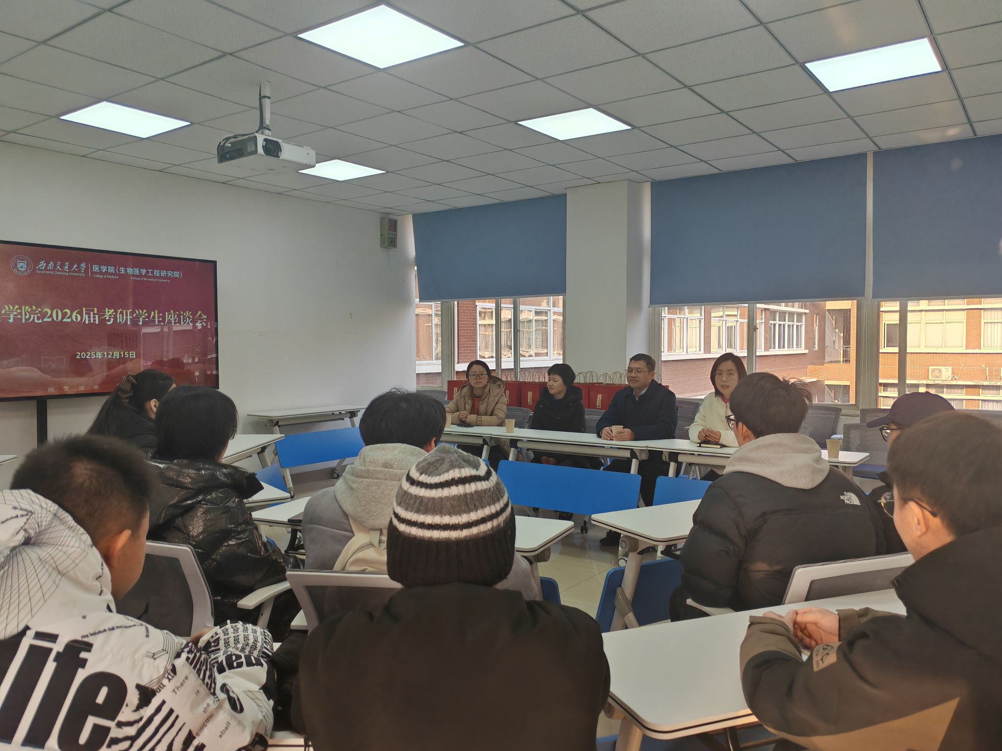 寒冬送暖,情满校园。随着全国硕士研究生招生考试日益临近,为鼓舞考研学子士气,缓解备考压力,坚定必胜信心,12月15日下午,我院在X2415A举行2026届考研学生座谈会,为学子们加油助力。医学院院长周绍兵,党委书记曾东红,副院长苟雪,党委副书记于楠,毕业班辅导员廖柯琳以及十余名名备战考研的学子共同参加了此次座谈会。