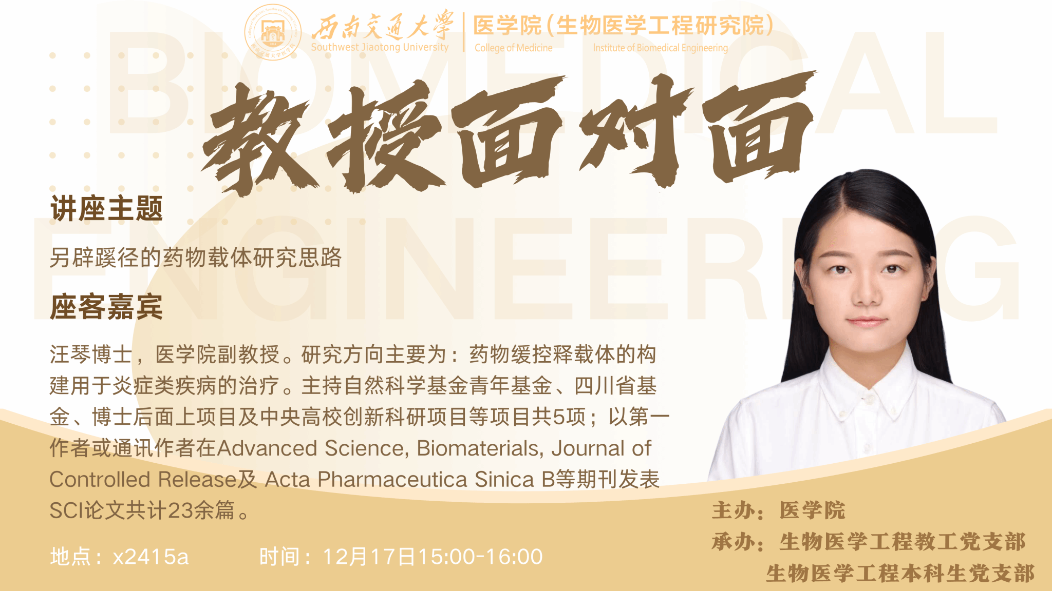汪琴博士,医学院副教授,研究方向主要为:药物缓控释载体的构建用于炎症类疾病的治疗。主持自然科学基金青年基金、四川省基金、博士后面上项目及中央高校创新科研项目等项目共5项;以第一作者或通讯作者在Advanced Science, Biomaterials, Journal of Controlled Release及 Acta Pharmaceutica Sinica B等期刊发表SCI论文共计23余篇。