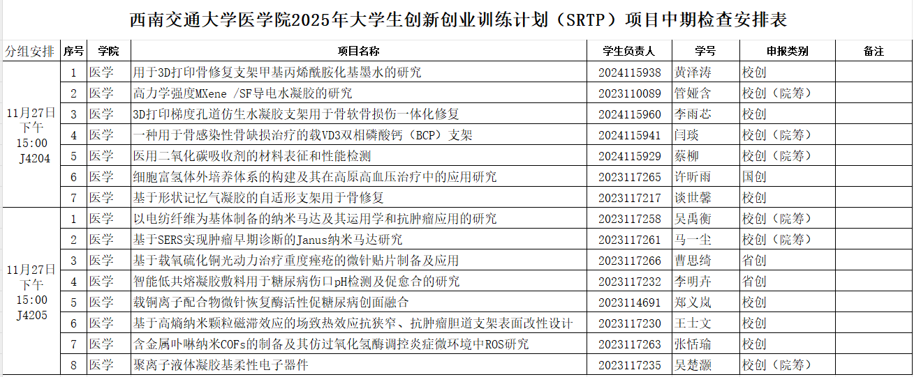 (3)根据学院安排,于2025年11月27日15:00,在九里校区J4204、J4205参与中期检查答辩,详见《西南交通大学医学院2025年大学生创新创业训练计划(SRTP)项目中期检查安排表》(图1)。